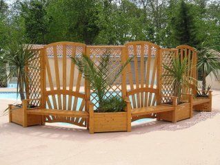 Composée d'un assemblage, de deux claustra de séparation, avec jardinières et treillage reliées par une claustra banc.