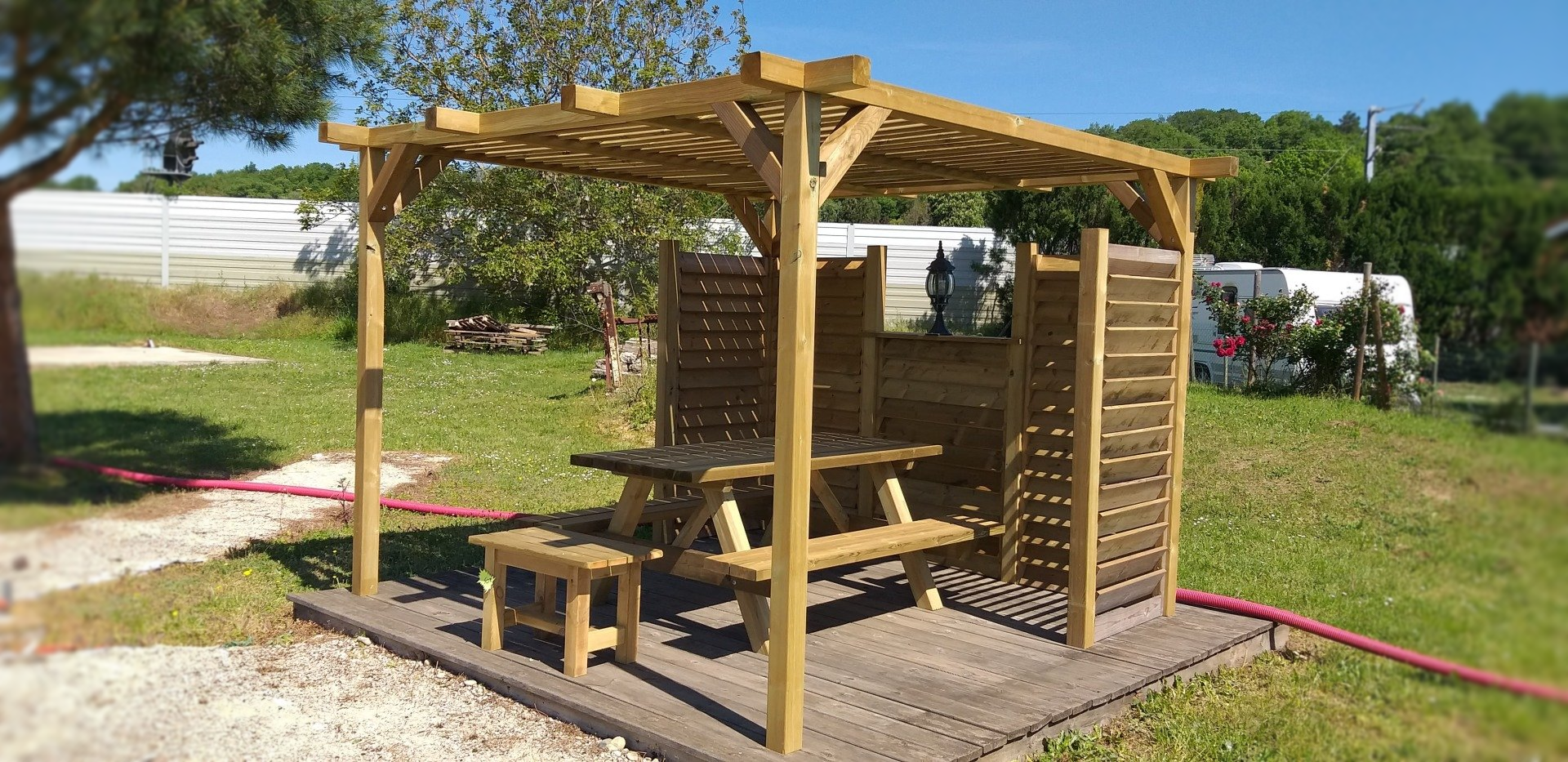 Pergola 3 x 3 m avec persiennes au dessus , ce qui permet d'avoir de la fraîcheur.